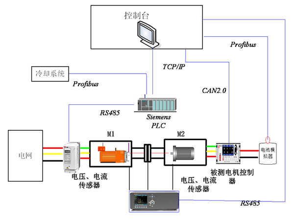 系统采取先进的四象限ASD深弱磁永磁同步电机驱动器作为负载控制器,负载能量回收采用交流母线回馈的模式,利用ASD的逆变装置控制负载电机完成加载及负载的调节。整个试验系统含ASD控制系统和计算机控制的测量系统、PLC控制系统等,系统技术先进、可靠性高、准确度高、重复性好,属于节能型试验系统,具有优良的性价比。
